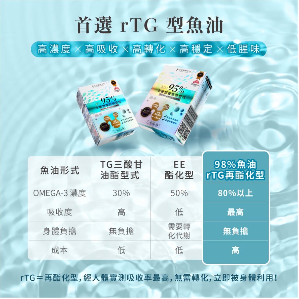 | 高濃度 (rTG 型優先) | 選擇 Omega-3 總濃度達 80% 以上,且吸收率最高的 rTG 型式魚油。濃度低(如 30%)會讓您攝取過多不必要的脂肪。 |