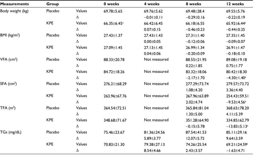 一篇日本研究(研究連結)登載於 Dove Medical Press(2018),為一項隨機、雙盲、安慰劑對照臨床試驗,研究的主要目的是觀察黑薑對腹部脂肪(內臟與皮下脂肪)及三酸甘油脂(TG)的臨床影響。受試對象為 日本輕度肥胖成年人(BMI 24–30),每日補充 150 mg 黑薑萃取(KPE),持續 12 週。結果顯示:
