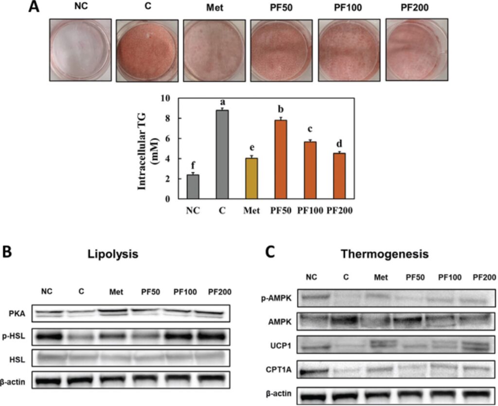 在Food & Nutrition Research(2023)的一項動物實驗(研究連結)指出,利用高脂飲食誘導的肥胖小鼠模型,探討黑薑在脂肪生成、分解、能量代謝與血脂調控上的影響機制。該研究揭示黑薑在分子層面上如何「開啟身體燃能迴路」。
