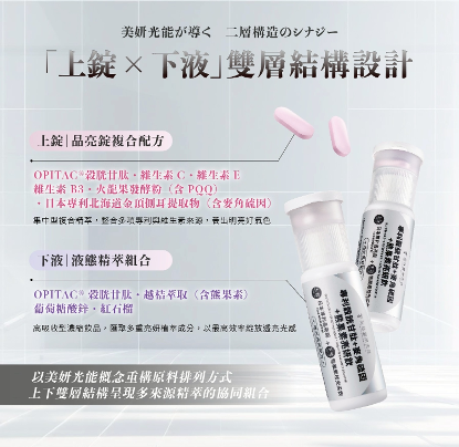 再加上「上錠 × 下液」的雙層設計,將不同特性的原料分層配置,避免彼此干擾、提升吸收效率,同時一次補足多重植萃與維生素來源。對於作息不規律、長時間待室內、外食比例高的人來說,這是一種高效率、低負擔、可長期執行的日常亮妍補給方式,也是一套真正能維持的「發光型亮妍策略」。