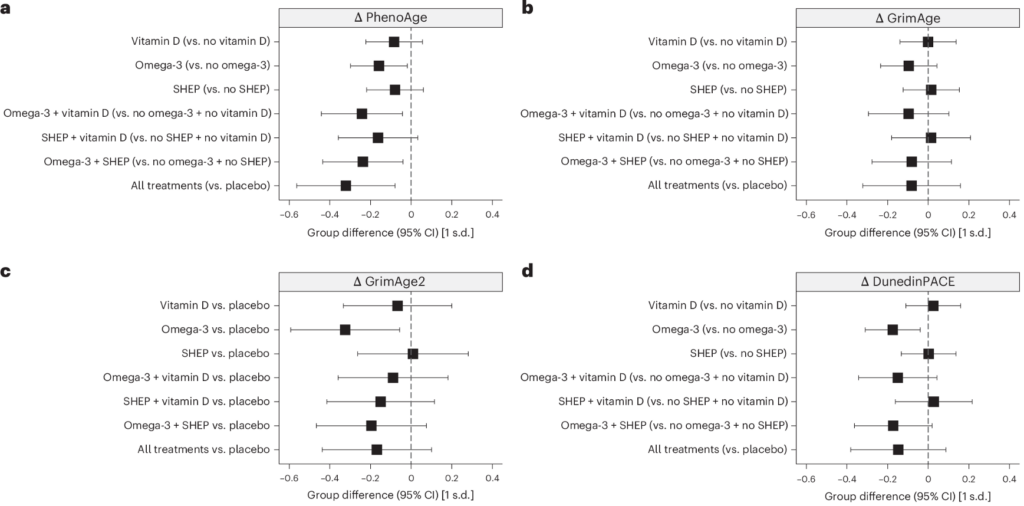 結果非常值得注意:Omega-3 單獨補充時,就能顯著延緩三種 DNA 老化時鐘(PhenoAge、GrimAge2、DunedinPACE)。而且當 維生素D + Omega-3 + 運動 三者一起介入時,在 PhenoAge 上呈現 明顯的加成抗老效果。