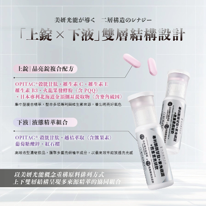 這樣的組合並不是為了追求立即改變,而是透過協同設計,讓身體在相對低刺激、可長期補充的狀態下,慢慢累積清透、明亮且不易波動的膚況表現。再搭配分層配置的上錠與下液設計,讓不同特性的營養各自發揮、提升吸收效率,對於作息不規律、長時間待在室內或外食比例偏高的人來說,是一種更省力、也更能長期維持的日常亮妍方式。