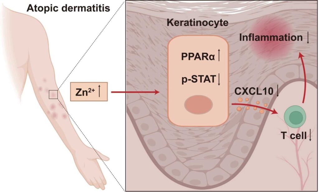 在細胞與動物實驗中,研究發現 葡萄糖酸鋅可活化 PPARα,抑制 STAT 訊號傳導,進而降低角質細胞釋放 CXCL10,有效減少免疫細胞過度聚集與發炎反應。在 AD 樣小鼠模型中,補充葡萄糖酸鋅後,血清 IgE 濃度下降、皮膚發炎程度減輕、皮膚厚度降低,CXCL10 表現亦明顯下調